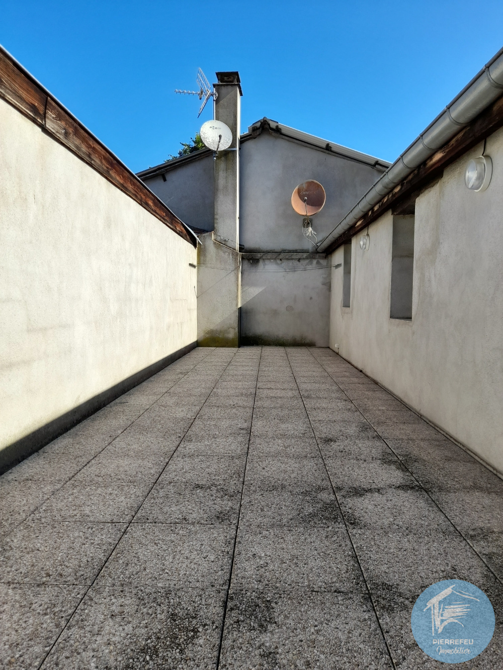 Au coeur du centre ville d'Amplepuis, dans une impasse tranquille au 16, passage de la Tête Noire (anciennement 4 impasse de l'Ancienne Providence), une maison de ville en duplex comprenant au rez-de-chaussée un hall d'entrée, une cuisine aménagée/équipée (four, plaque 4 feux gaz, hotte, réfrigérateur et rangements), une salle d'eau avec WC, une chambre, une buanderie, à l'étage un petit séjour/ salon, deux chambres, une salle de bains avec WC, une très grande terrasse sans vis-à-vis. Le logement est équipé d'un chauffage individuel au gaz de ville . L'entretien annuel de la chaudière est obligatoire et à la charge du locataire.Disponibilité mi-avril 2026.