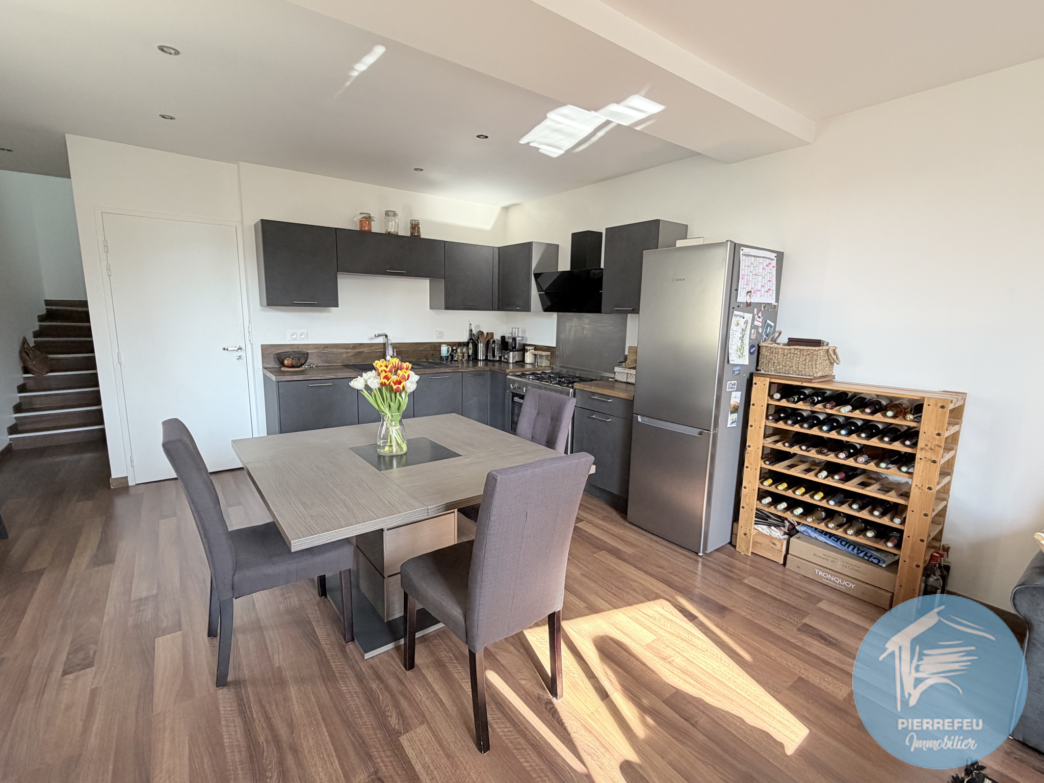 - Le premier niveau offre une agréable pièce de vie d’environ 30 m², comprenant : une cuisine ouverte entièrement équipée, et un salon convivial avec cheminée d’agrément.