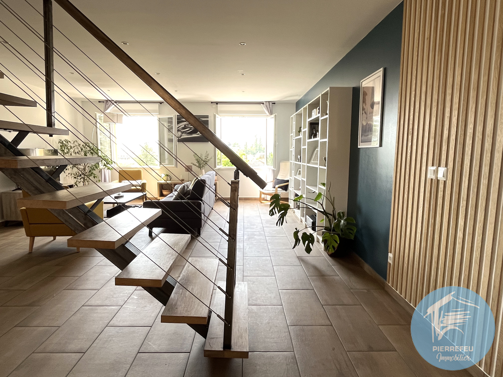 PIERREFEU Immobilier vous propose dans le Beaujolais - Pierres Dorées, en centre Bourg du Bois D'oingt, ce magnifique Duplex de 2017 d'une surface habitable d'environ 180m2. Le bien, de type 6, est modulable (chambres/bureaux), traversant Est/Ouest, et mitoyen. Il offre de généreux volumes répartis sur 2 niveaux comme suit : Rez-de-chaussée : entrée avec nbrx rangements donnant sur une grande pièce à vivre de 57m2, cuisine ouverte et accès à un bel espace extérieur de plain-pied. Une chambre, une buanderie / chaufferie, et un Wc séparé complètent ce niveau. A l'étage, vous disposerez de 4 grandes chambres/bureaux (min 14,40m2) dont une suite parentale d'environ 25m2 avec sde attenante, une salle de bains et un Wc séparé. 2 places de stationnement extérieur. Bien soumis au statut de la copropriété (géré en ASL). Nbr total de lots : 8. Faibles charges. Quote part annuelle : 115 euros /trimestre. Aucun procédure en cours. Chauffage : Pompe à chaleur (sol/radiateurs) avec option rafraichissement possible. Panneaux photovoltaïques en autoconsommation (abonnement à prévoir). DPE : A. Assainissement : Tout à l'égout. Notre avis : La performance énergétique, les volumes, les matériaux de qualité, le calme, la proximité immédiate des commodités (écoles et commerces à Pied, ramassage scolaire, gares Legny et Lozanne, A89, etc.). Visites et renseignements : Muriel Chauplannaz - Agent commercial indépendant de la SARL Pierrefeu Immobilier - Immatriculée au R.S.A.C de Lyon sous le Numéro 843 741 570.