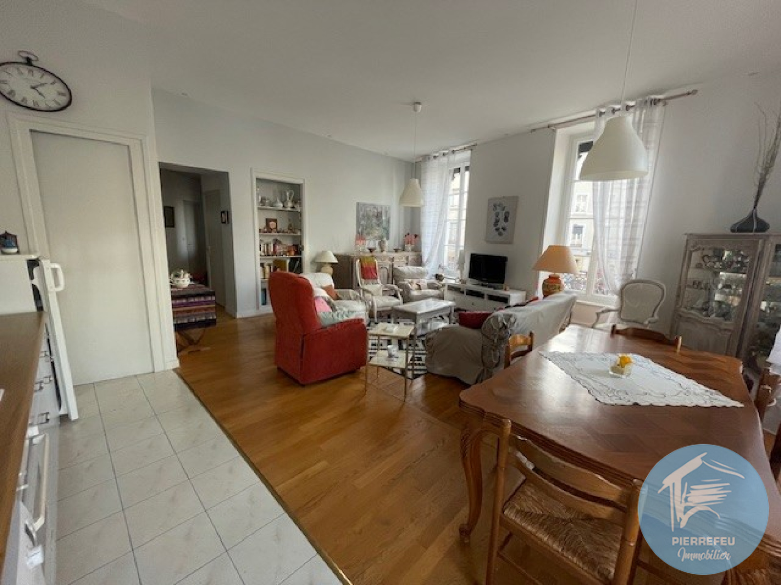 Appartement au 1er étage, traversant et lumineux, de style bourgeois (parquets en bois massif, grande hauteur sous plafond...) et en excellent état proposant un séjour-salon-cuisine spacieux, cellier, trois chambres, une salle de bain, un wc et dégagements avec placards. Une cave et un grenier complètent le bien. Chauffage individuel au gaz de ville. Le plus : un débarras pouvant facilement être aménagé en salle de bain...