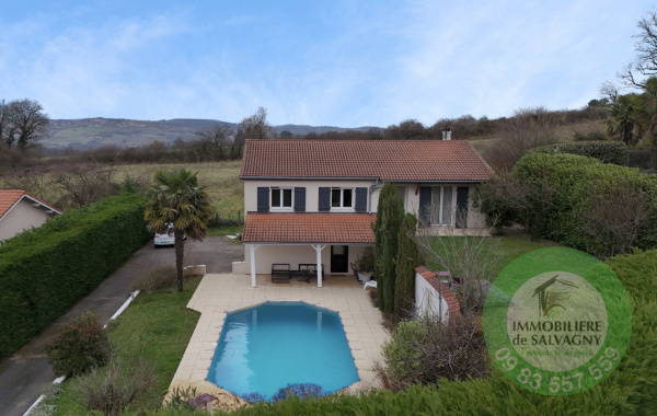 Immobilière de Salvagny vous présente, dans un quartier calme et résidentiel, avec vue dégagée, cette maison d'habitation individuelle (non mitoyenne), lumineuse et parfaitement entretenue offrant une superficie d’environ 133 m² habitables, implantée sur un joli terrain clos et arboré de 821 m², agrémenté d’une piscine idéale pour les beaux jours.