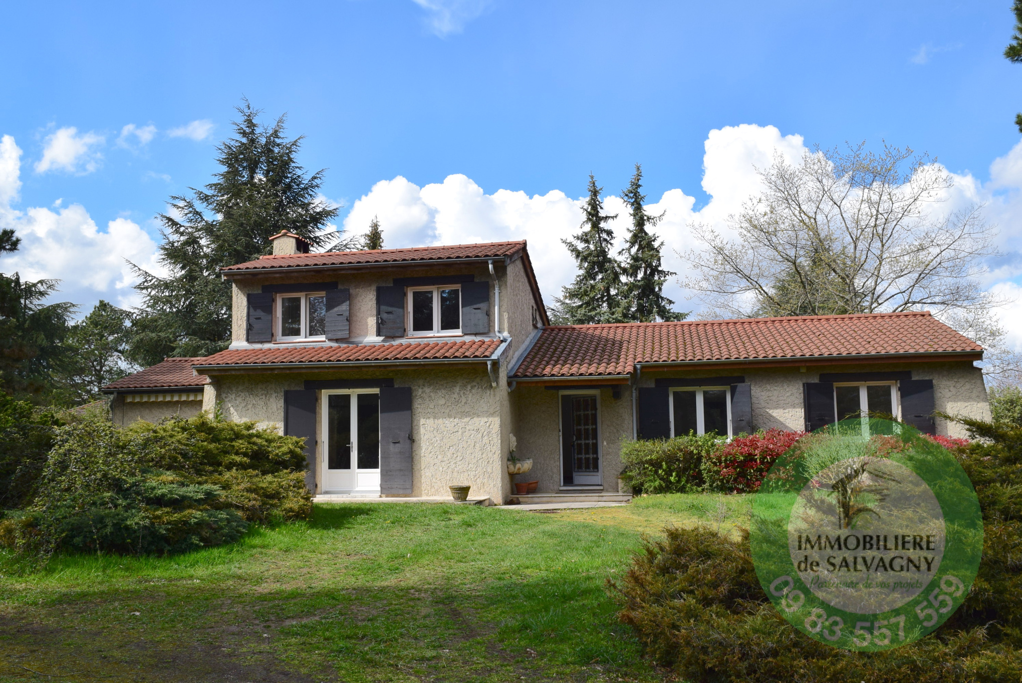 EXCLUSIVITE - L'Immobilière de Salvagny vous présente sur la commune de Dommartin dans un environnement calme et verdoyant, cette maison de 172 m2, essentiellement de plain-pied sur un terrain plat de 2386 m2 clos, arboré et piscinable. Elle offre 143 m2 au RDC composé d'une pièce de vie de plus de 53 m3 avec un salon double, une salle à manger. La cuisine de 18 m2 est ouverte et équipée et sa buanderie aménagée. Nous trouvons également un espace bureau, une grande chambre parentale avec salle de bains, toilettes et nombreux rangements, une seconde chambre, une salle d'eau et un wc séparé. A l'étage, un coin nuit avec sa chambre, une salle d'eau, son dressing et toilettes. Le sous-sol de 30 m2 abrite une cave, une chaufferie et un local rangement. Bon état général. Contact au 09 83 557 559.