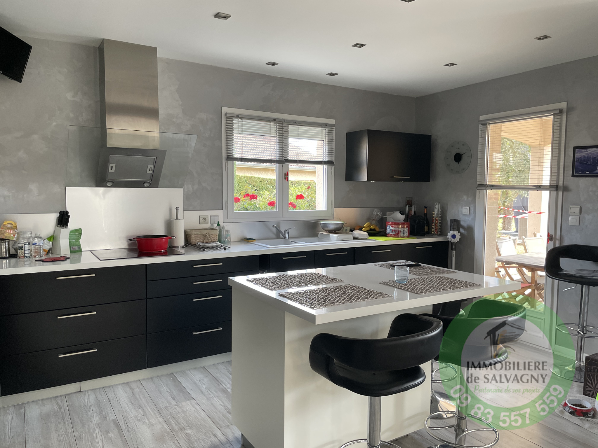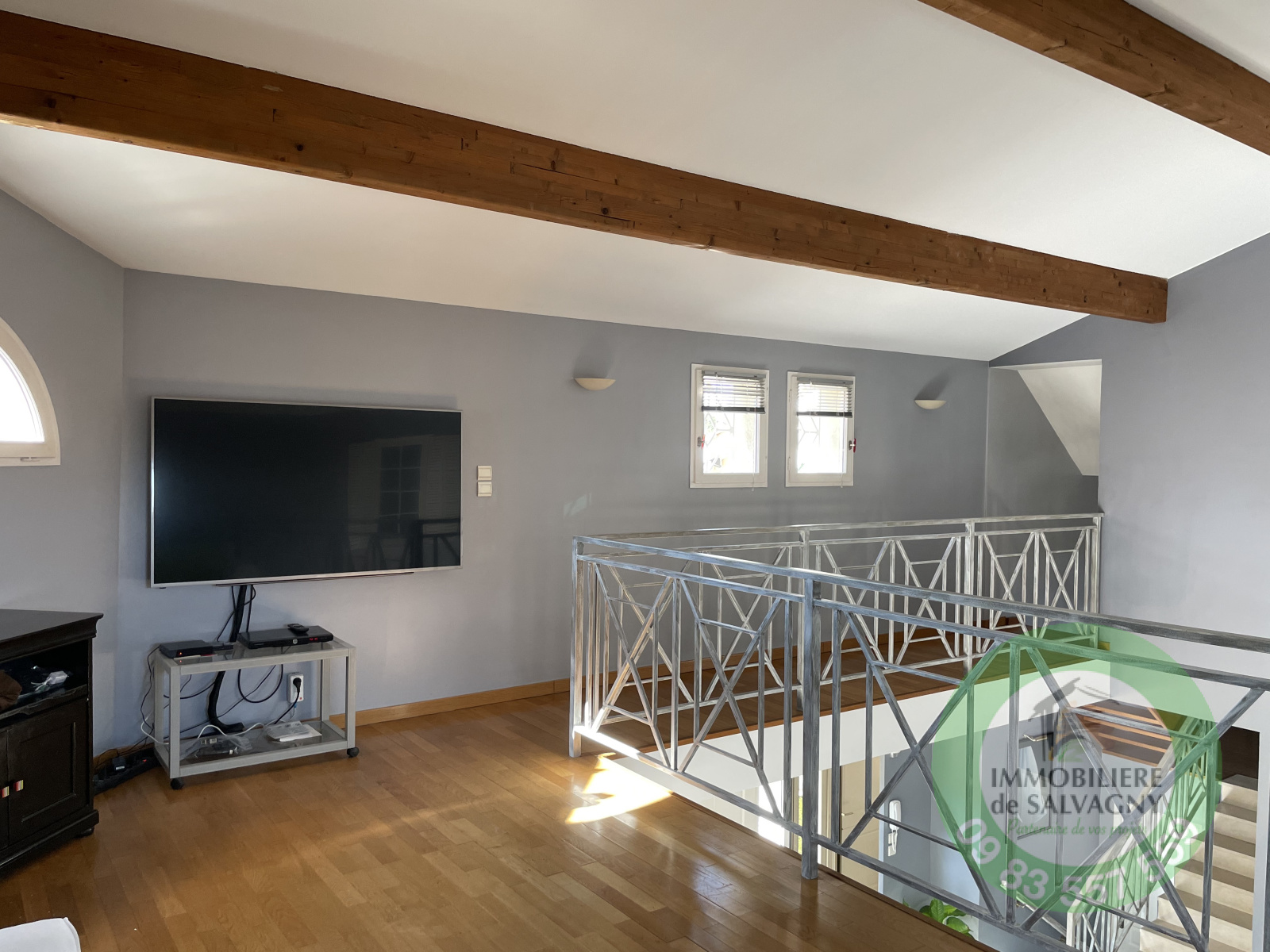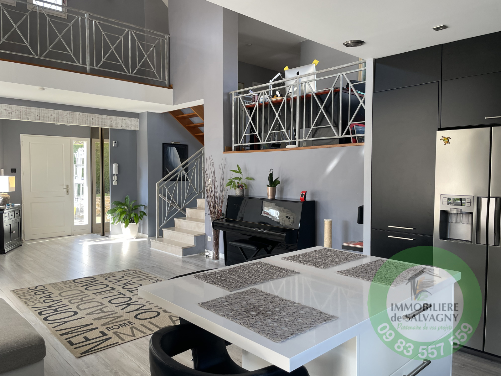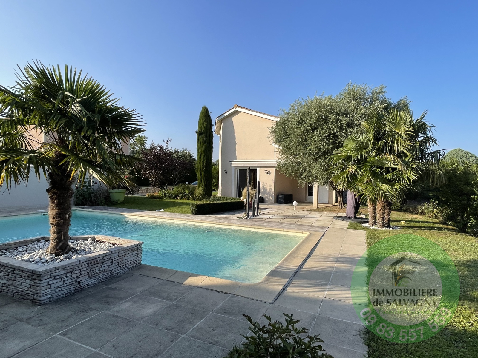 Aux portes de la Tour de Salvagny, à proximité du golf, dans un cadre privilégié, maison très lumineuse de 145 m2 habitables comprenant un séjour cathédrale d'une surface de 45m2 ouvrant sur terrasse, une cuisine ouverte de marque SCHMIDT (entièrement équipée), un bureau, un coin nuit avec 3 chambres dont une chambre parentale avec salle d'eau, une salle de bains et un wc séparé. En complément : une mezzanine de 23m2 à usage de salon télé. Cette maison dispose également d'un garage double, d'une buanderie, d'un coin atelier et d'une quatrième chambre (amis ou bureau). La maison est édifiée sur un terrain arboré et clos de 930 m2 avec piscine au sel et local technique. A l'extérieur, on trouve un carport attenant à la maison pour deux véhicules et un abri de jardin. Chauffage par pompe à chaleur de 2019. DPE: C - Contact au 09 83 557 559