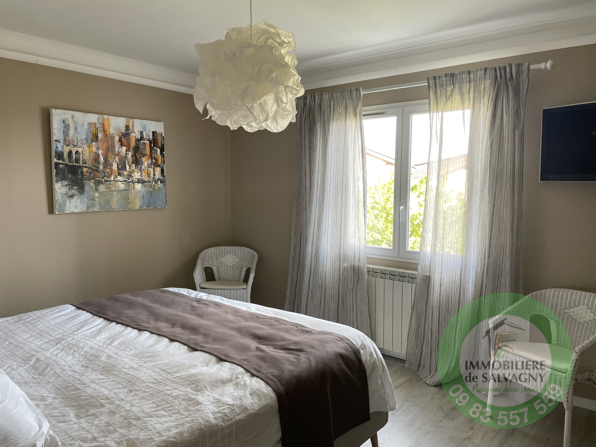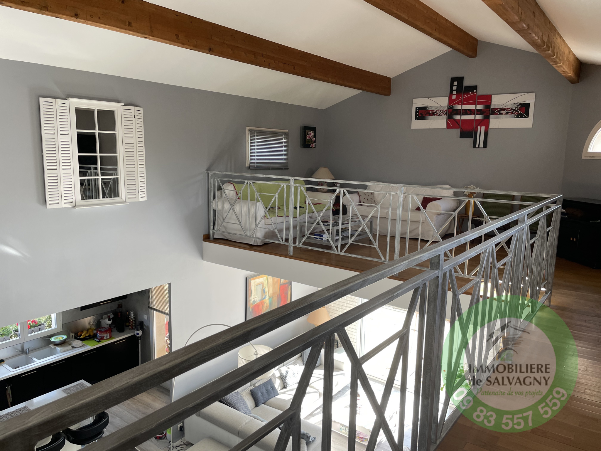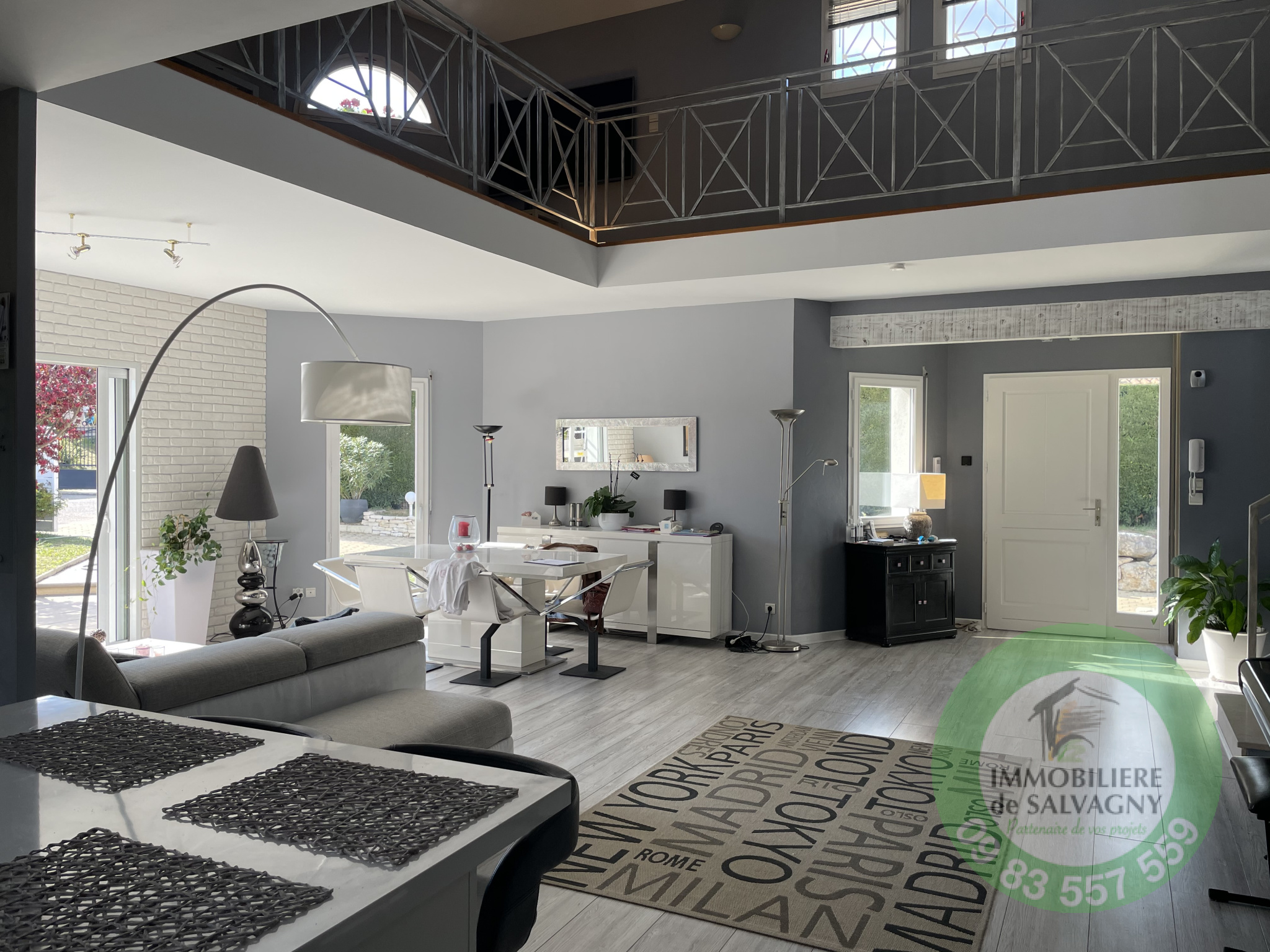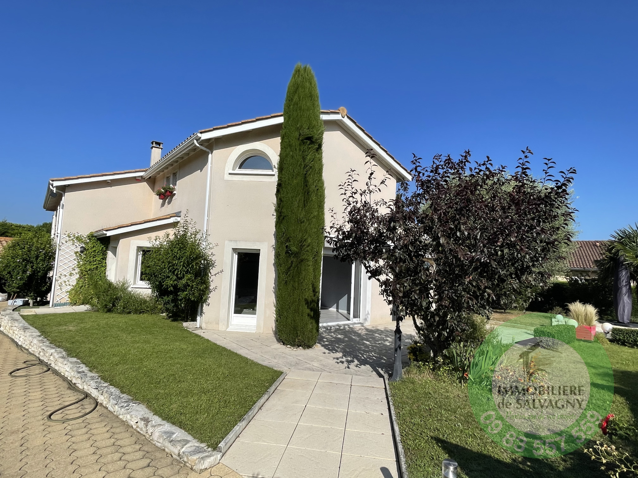 Aux portes de la Tour de Salvagny, à proximité du golf, dans un cadre privilégié, maison très lumineuse de 145 m2 habitables comprenant un séjour cathédrale d'une surface de 45m2 ouvrant sur terrasse, une cuisine ouverte de marque SCHMIDT (entièrement équipée), un bureau, un coin nuit avec 3 chambres dont une chambre parentale avec salle d'eau, une salle de bains et un wc séparé. En complément : une mezzanine de 23m2 à usage de salon télé. Cette maison dispose également d'un garage double, d'une buanderie, d'un coin atelier et d'une quatrième chambre (amis ou bureau). La maison est édifiée sur un terrain arboré et clos de 930 m2 avec piscine au sel et local technique. A l'extérieur, on trouve un carport attenant à la maison pour deux véhicules et un abri de jardin. Chauffage par pompe à chaleur de 2019. DPE: C - Contact au 09 83 557 559