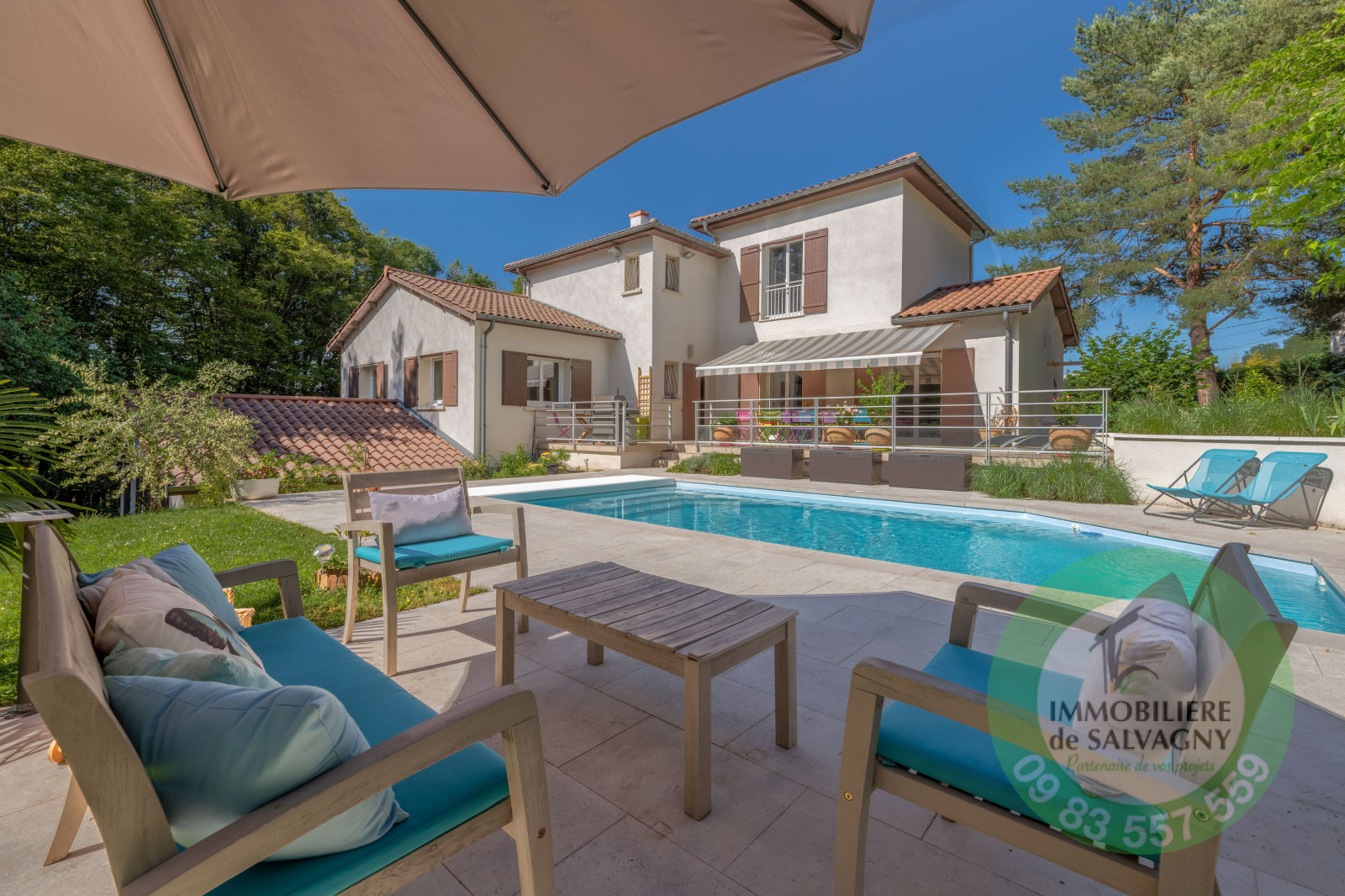 Aux portes de Dommartin, sur la commune de Civrieux d'Azergues : AU CALME, magnifique maison famililale de 215 m2 habitables. Terrain et parc de 3052 m2. Superbe piscine chauffée. Cette maison offre de beaux volumes et des prestations de qualité. Au RDC : séjour avec accès à la terrasse et à la piscine, une grande cuisine équipée et séparée, 2 grandes chambres, une salle d'eau, un WC séparé. Au 1er étage : le coin nuit parents est climatisé et doté d'une chambre de 27 m2, d'un dressing et d'une SDB (bains + douche + WC). En RDJ : un 3ème coin nuit composé de 2 grandes chambres, d'une SDE avec WC. Cette villa dispose également d'un sous-sol avec garage, buanderie et cave. ENVIRONNEMENT EXCEPTIONNEL - Proche commerces et bus - Chauffage par géothermie - Contacter Immobilière de Salvagny au 09 83 557 559