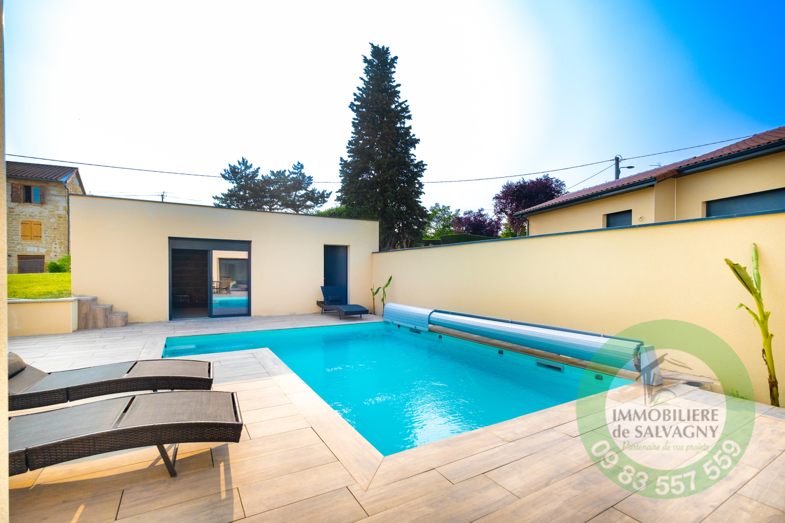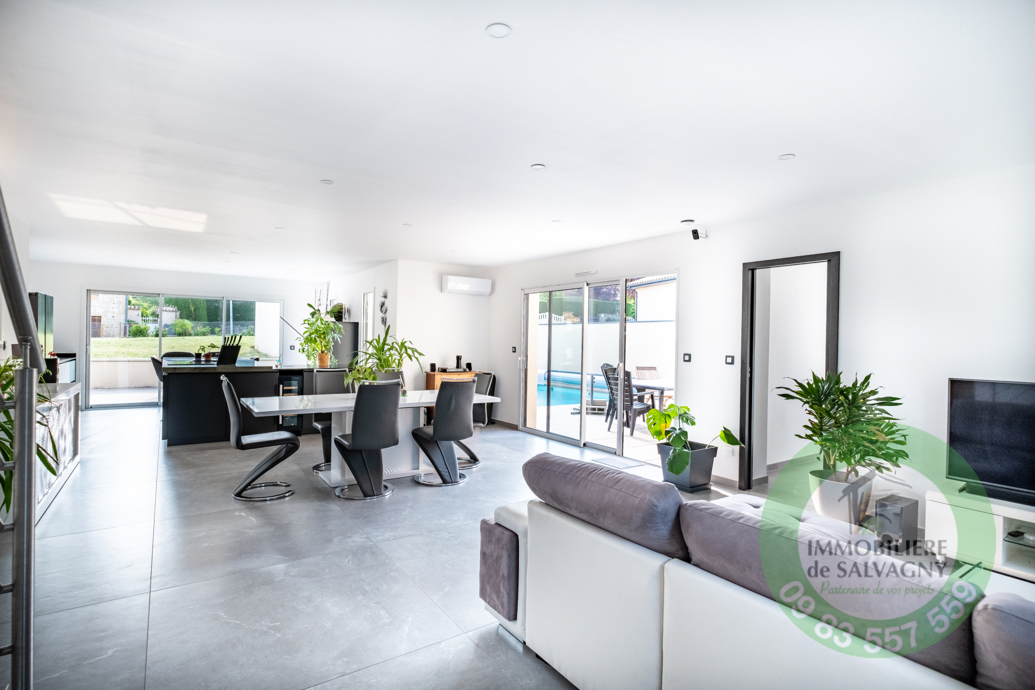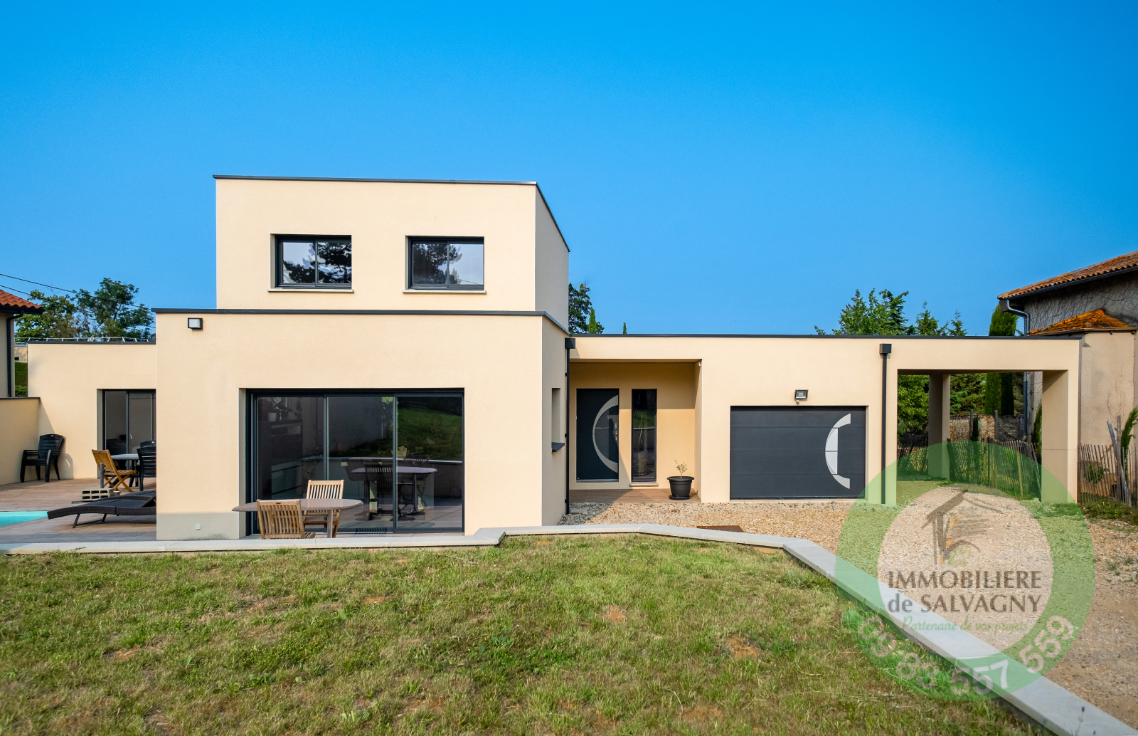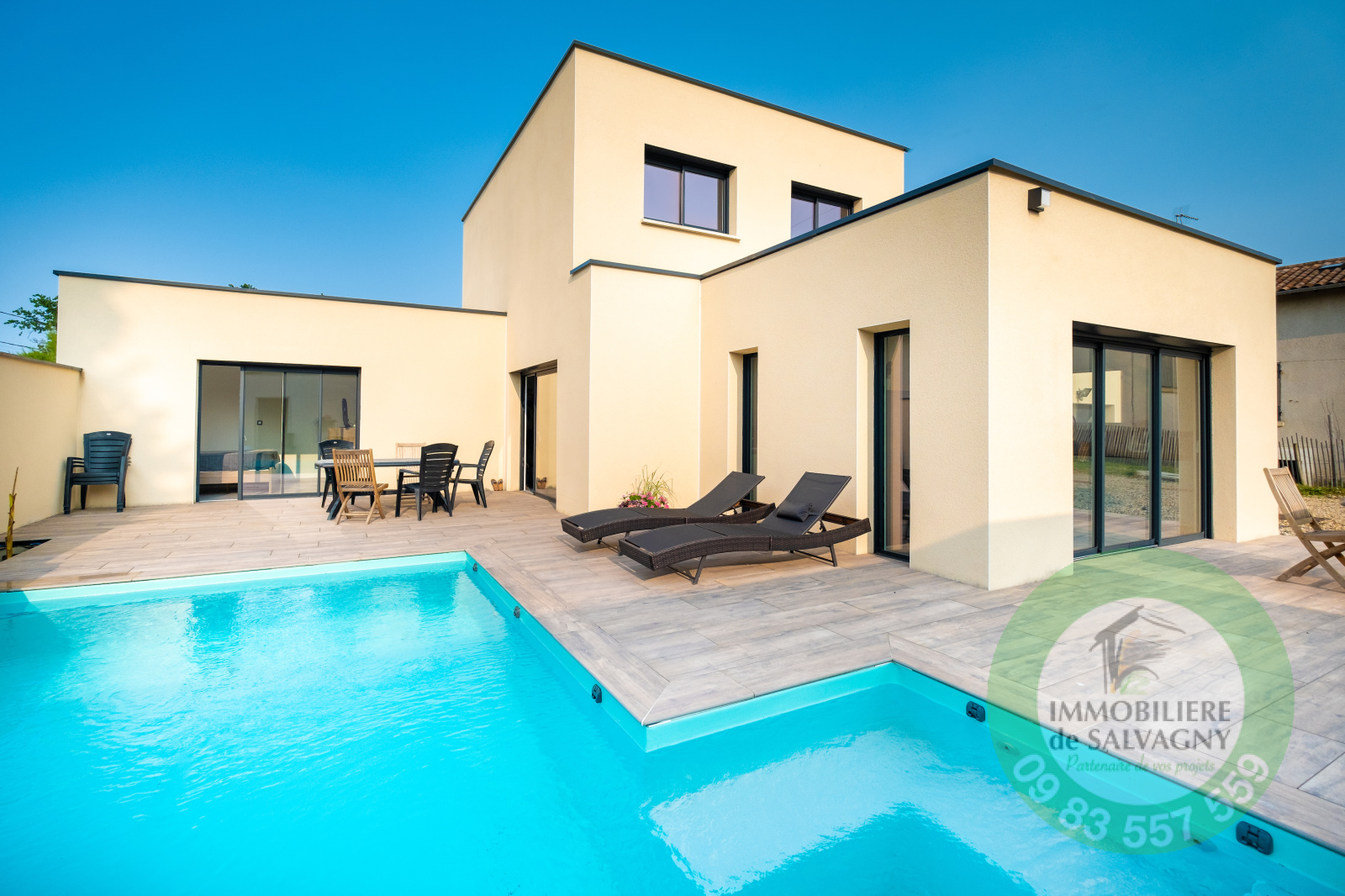 Immobilière de Salvagny vous présente, cette superbe maison contemporaine de 150 m2 construite en 2021 sur un terrain de 1007 m2. Vous serez séduits par ses prestations !!! Environnement calme et paisible. De plain-pied, une pièce à vivre lumineuse de 64 m2 ouvrant sur une terrasse de 78 m2, une cuisine type US entièrement équipée, une suite parentale de 30 m2 (dont une salle de bains avec baignoire, douche et WC et un dressing aménagé), un cellier / buanderie, un WC séparé. A l'étage, deux belles chambres avec placard mural et une superbe salle d'eau avec douche et WC. En complément : garage, abri voiture, une cave, parkings. En extérieur : une piscine au sel (6X3) avec volet motorisé, un pool-house pouvant être aménagé en chambre d'amis (ou bureau). Prestations de qualité : volets motorisés en Alu, systéme domotique pour pilotage des volets et des éclairages, chauffage par PAC, climatisation, adoucisseur d'eau, alarme,... Commerces à 2 mn en voiture. DPE : A - Pour plus de renseignements et visites : nous contacter.