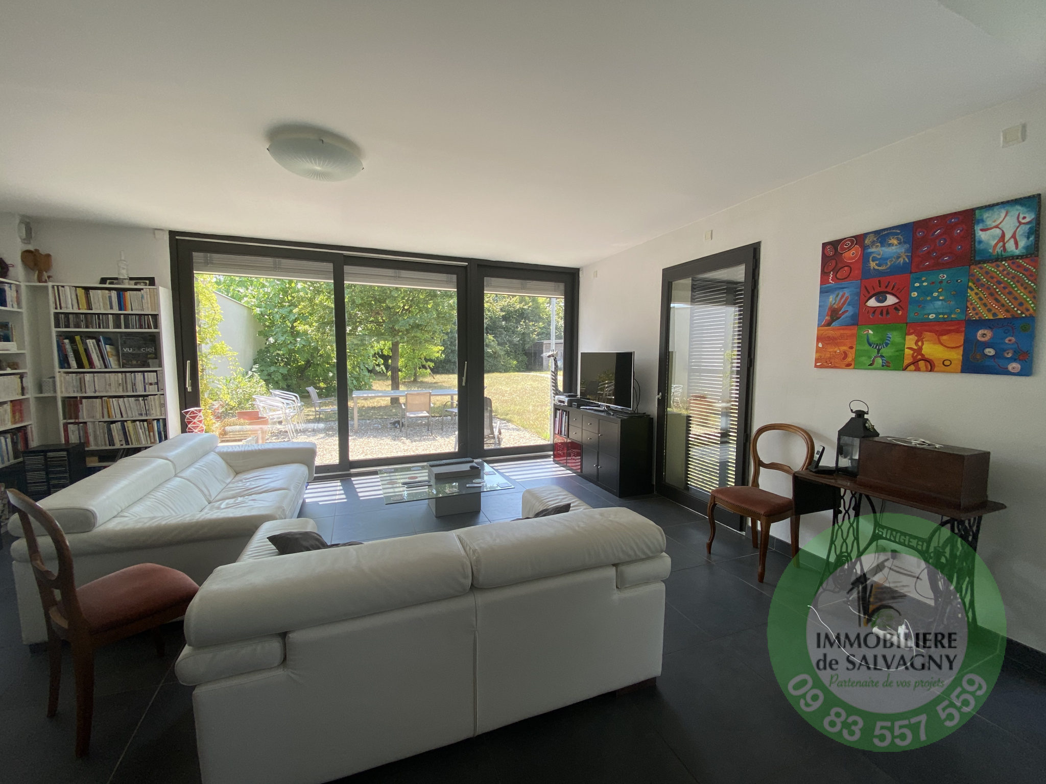 Dans un secteur pavillonnaire et calme, maison de plain-pied à l'esprit contemporain (construction 2006) de 146 m2 habitables édifiée sur un terrain clos et arboré de 820 m2. Agencement exceptionnelle : toutes les pièces ouvrent sur le jardin. Vous disposez d'une pièce de vie de 55 m2 composée d'une cuisine US équipée (avec cellier) et d'un séjour / salle à manger ouvrant sur terrasse (expo Sud). Le coin nuit dispose de 4 chambres (avec placard mural), une salle d'eau, une salle de bains, deux WC, une buanderie/chaufferie. En complément : deux grands garages doubles . LES PLUS : maison très lumineuse, aucun vis à vis, volets motorisés avec commande centrale, adoucisseur d'eau. Terrain piscinable. Chauffage par panneaux solaires et relais au gaz naturel. Un récupérateur des eaux pluviales alimente les toilettes, le lave-linge et l'arrosage extérieur. La maison est équipée d'un puits canadien qui assure un rafraîchissement des pièces principales. Situation : à quelques minutes à pied du Village, du collège et du Tram. Renseignements et visites : IMMOBILIERE DE SALVAGNY - 09 83 557 559
