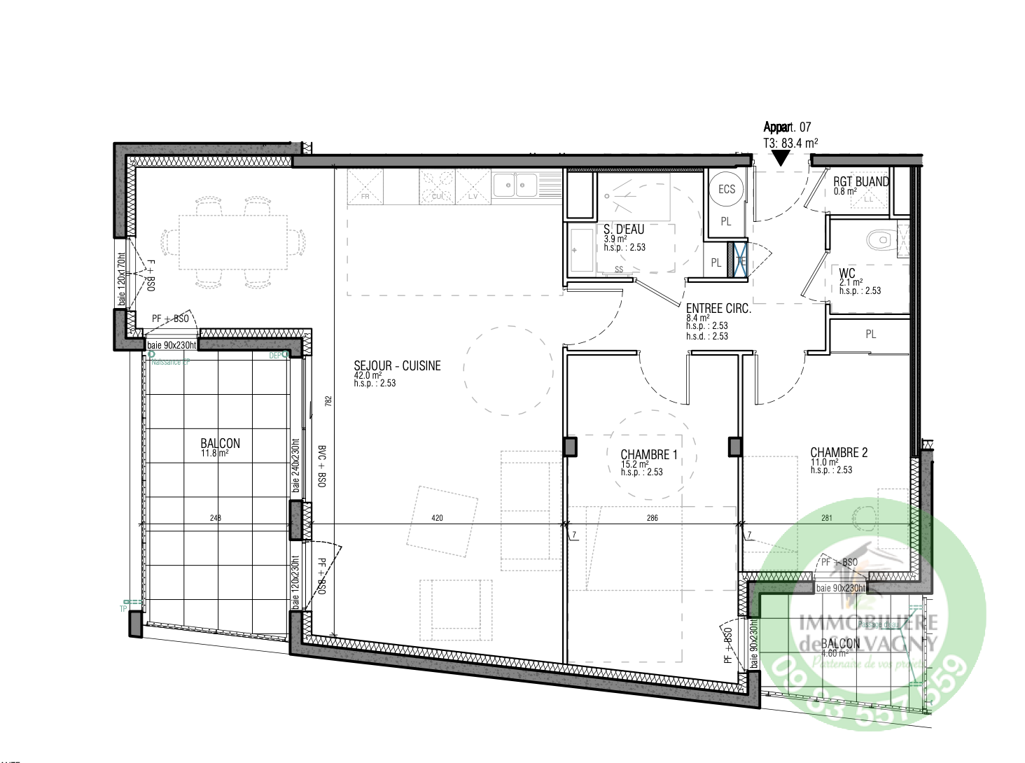 Disponible de suite au 4 rue de Lyon et EN EXCLUSIVITÉ chez Immobilière de Salvagny, au coeur du village de La Tour de Salvagny, résidence les Coquelicots... le plaisir de tout faire à pied ! Vous bénéficiez d'une qualité de vie privilégiée, dans une résidence intimimiste aux prestations haut de gamme. Situé au 1er étage, exposé sud/ouest, superbe T3 de 81,44 m², proposant une pièce de vie de 41 m2 ouvrant sur un balcon de 11,8 m², 2 chambres dont une avec balcon de 4,43 m², salle d'eau, buanderie et WC séparé. Prestation unique : plancher chauffant et rafraîchissant par pompe à chaleur. Les plus : huisseries en aluminium haut de gamme, volets de type BSO (brise-soleil orientable) motorisés en aluminium, carrelage 60x60 en grès cérame pour la partie jour, parquet chêne français dans l'espace nuit, peinture de finition de qualité, visiophone et boite aux lettres connectés, garage (en supplément) en sous-sol avec possibilité d'une porte motorisée et prise IRVE. Local à vélo. Une vie en coeur de bourg (commerces, services, écoles, bus, navette gratuite pour la gare). Liaison A89/M6 à 2 mn. Pour tous renseignements contacter Sylvie MACHADO, Immobilière de Salvagny By Pierrefeu Immobilier.