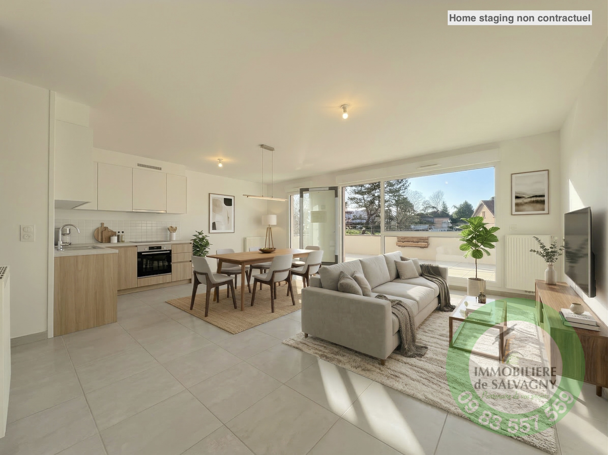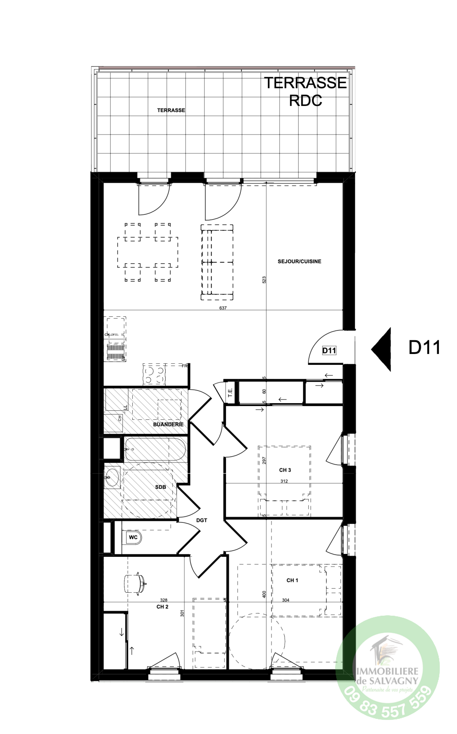 DISPONIBLE DE SUITE - Dans un cadre verdoyant et intimiste, au coeur de la Tour de Salvagny, appartement d'une surface habitable de 80,25 m² en rez-de-chaussée. Il propose une pièce de vie de 35,55 m² ouvrant sur une terrasse privative de 17,25 m² exposée ouest, 3 chambres, salle de bains, buanderie et WC séparé. Les prestations : Normes RT 2012, parquet stratifié dans les chambres, carrelage grès cérame 45x45 cm, vidéophone, volets roulants aluminium, placards aménagés, WC suspendu...Chauffage individuel : chaudière gaz à condensation. Equipé de panneaux photovoltaïques pour production d'électricité en autoconsommation. Deux places de parking. Pour tous renseignements et visite contacter Immobilière de Salvagny by Pierrefeu Immobilier.