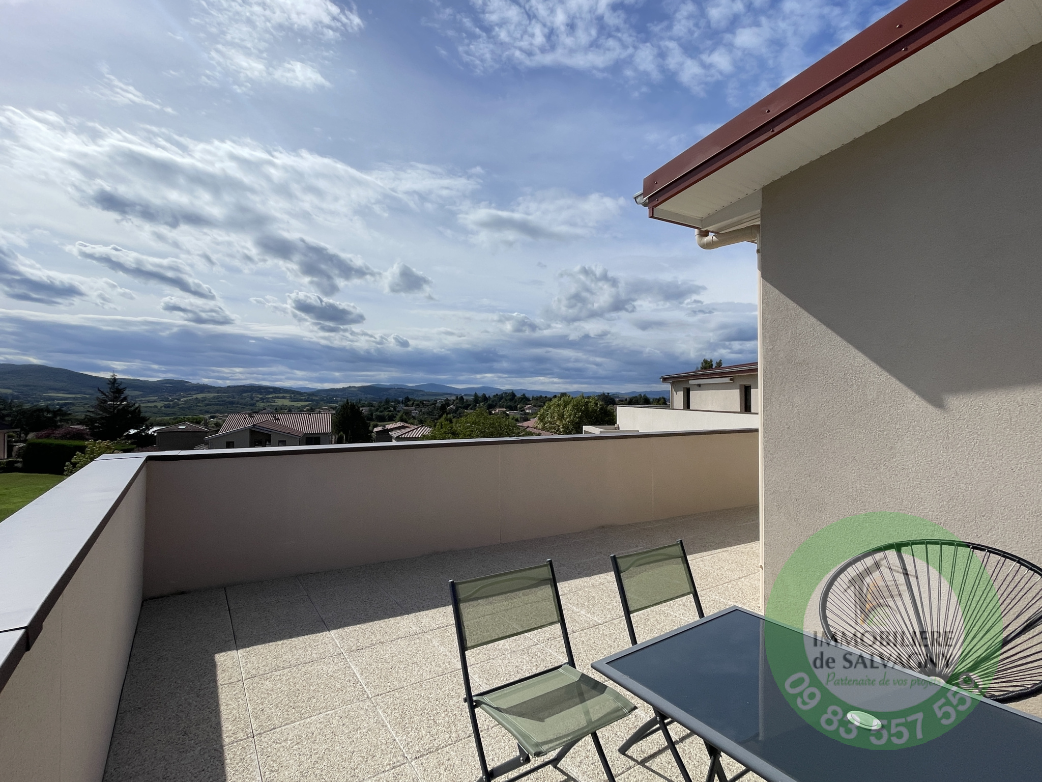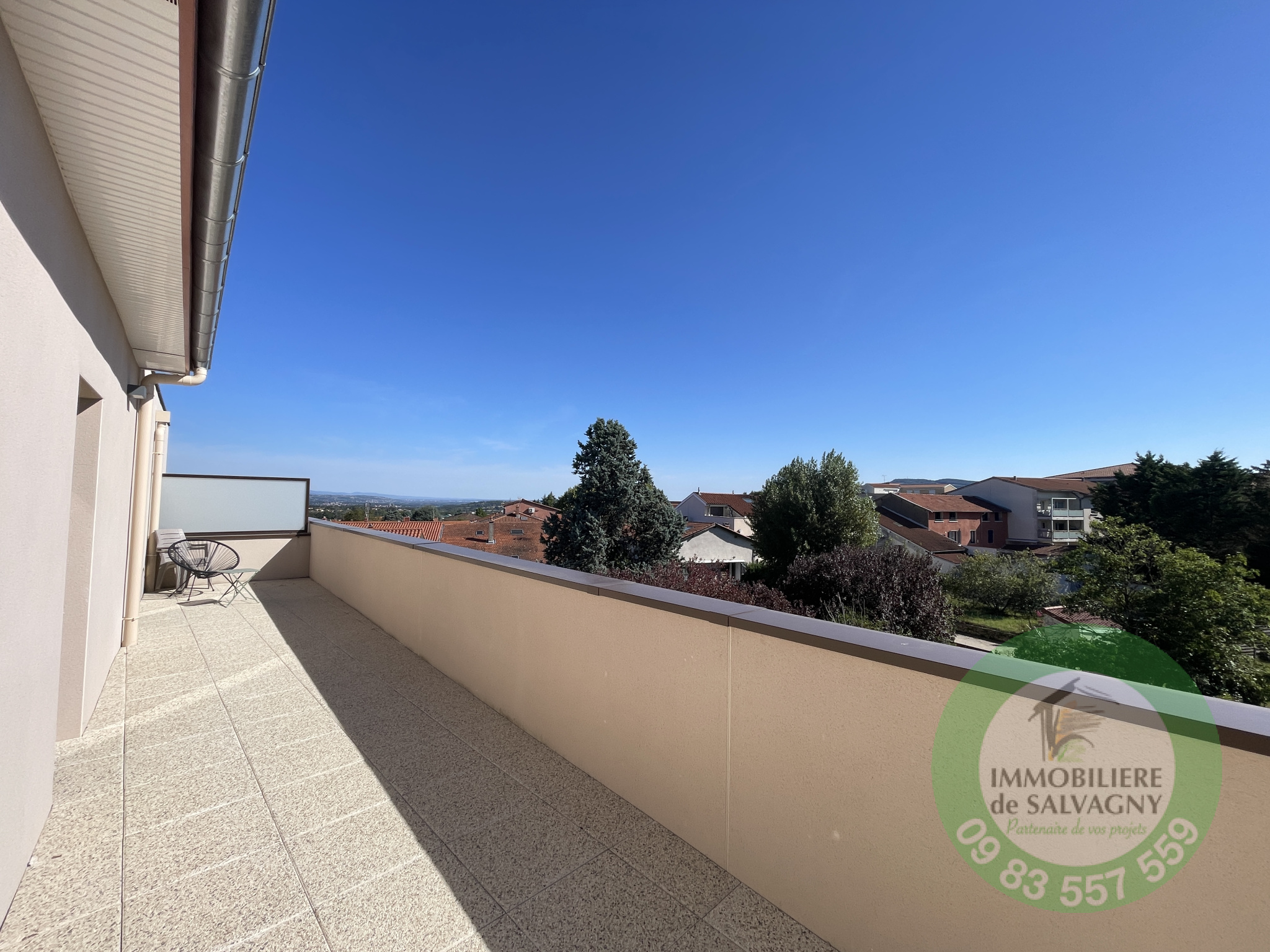 Immobilière de Salvagny vous présente ce magnifique T4 de 88 m² type MAISON SUR LE TOIT, bénéficiant d'une incroyable terrasse de 97 m² avec une très belle vue dégagée. Situé au centre du village de La Tour de Salvagny, ce bien propose une pièce de vie baignée de lumière comprenant une cuisine équipée ouverte, 3 chambres dont une avec salle d'eau attenante, une deuxième salle d'eau avec toilettes et un 2ème WC séparé. Ce bien est vendu avec un garage double en sous-sol. Triple exposition Est, Sud, Ouest. Proximité immédiate des commerces, écoles et transports. Copropriété de 2024, sécurisée, pas de procédure en cours. Charges mensuelles de copropriété 151 €. DPE: B. Pour renseignements et visites contacter Sylvie MACHADO, Immobilère de Salvagny by Pierrefeu Immobilier.