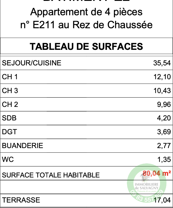 DISPONIBLE DE SUITE - Dans un cadre verdoyant, au coeur de la Tour de Salvagny, un appartement d'une surface habitable de 80 m². Il propose une pièce de vie de 35.54 m² ouvrant sur une terrasse de 17 m² exposée ouest, 3 chambres, salle de bains, buanderie et WC séparé. Les prestations : Normes RT 2012, parquet stratifié dans les chambres, carrelage grès cérame 45x45 cm, vidéophone, volets roulants aluminium, placards aménagés, WC suspendu...Chauffage individuel : chaudière à condensation au gaz. Deux places de parking. Pour tous renseignements contacter Immobilière de Salvagny by Pierrefeu Immobilier.