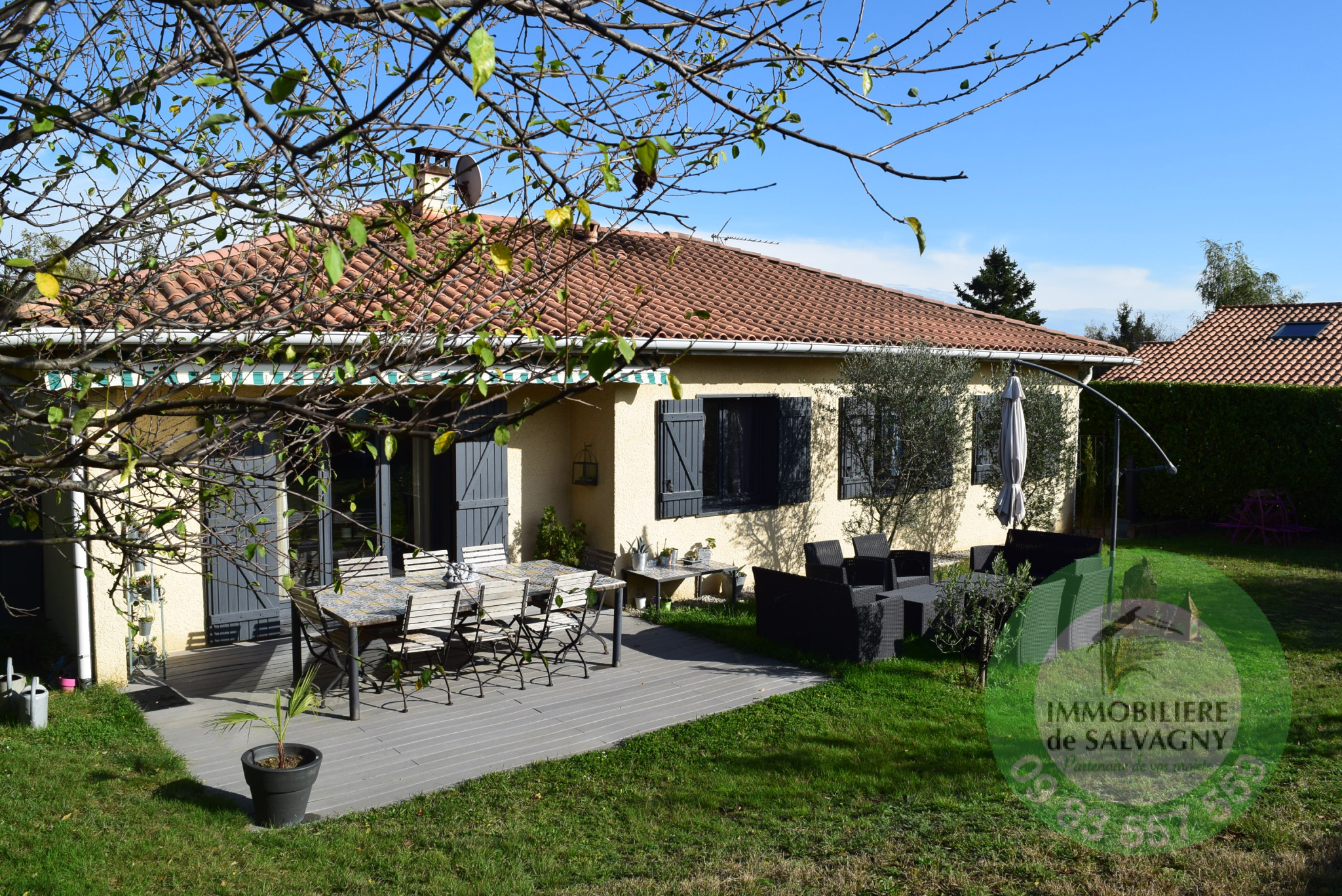 EXCLUSIVITE - L'agence Immobilière de Salvagny vous propose dans un cadre privililégié et calme, proche du centre et des commerces, cette maison de plain-pied en très bon état de 136 m2. Vous serez séduits par sa belle pièce de vie lumineuse de 35 m2 ouvrant sur deux terrasses exposées Est et Ouest, sa grande cuisine, 4 chambres dont une chambre parentale avec son dressing, sa salle de bains et WC. En complément, une salle d'eau, un WC séparé, une buanderie/cellier. Magnifique terrain de 745 m2 clos, arboré avec deux abris de jardin et un jeu de boules . Aucun vis à vis. Contact au 09 83 557 559