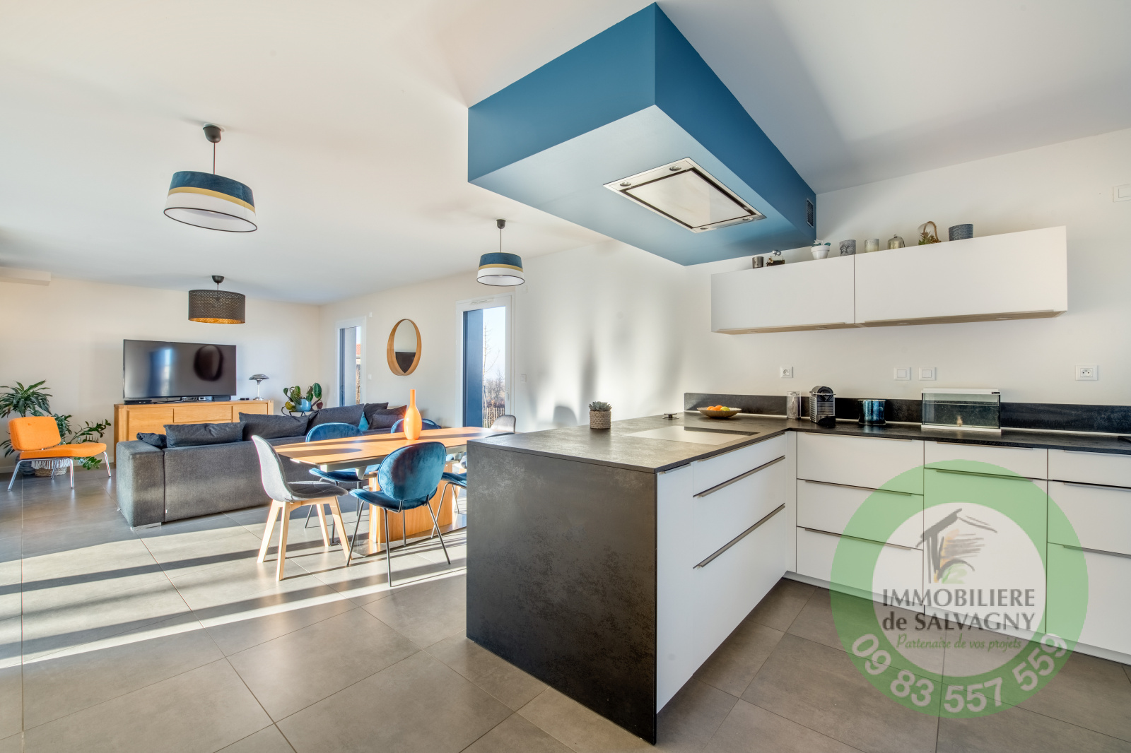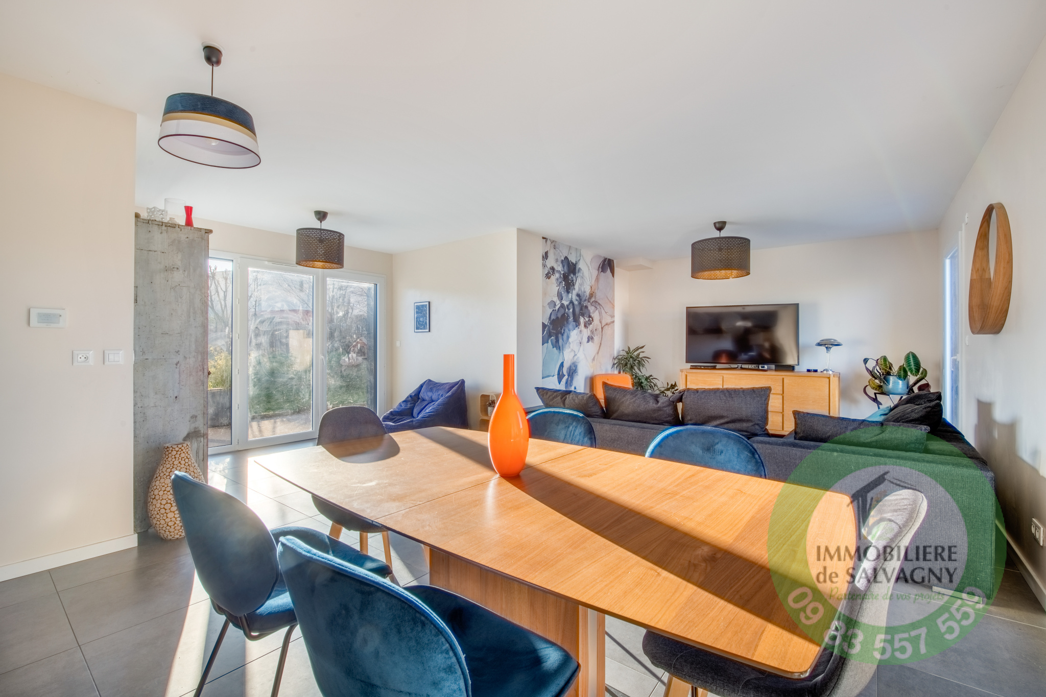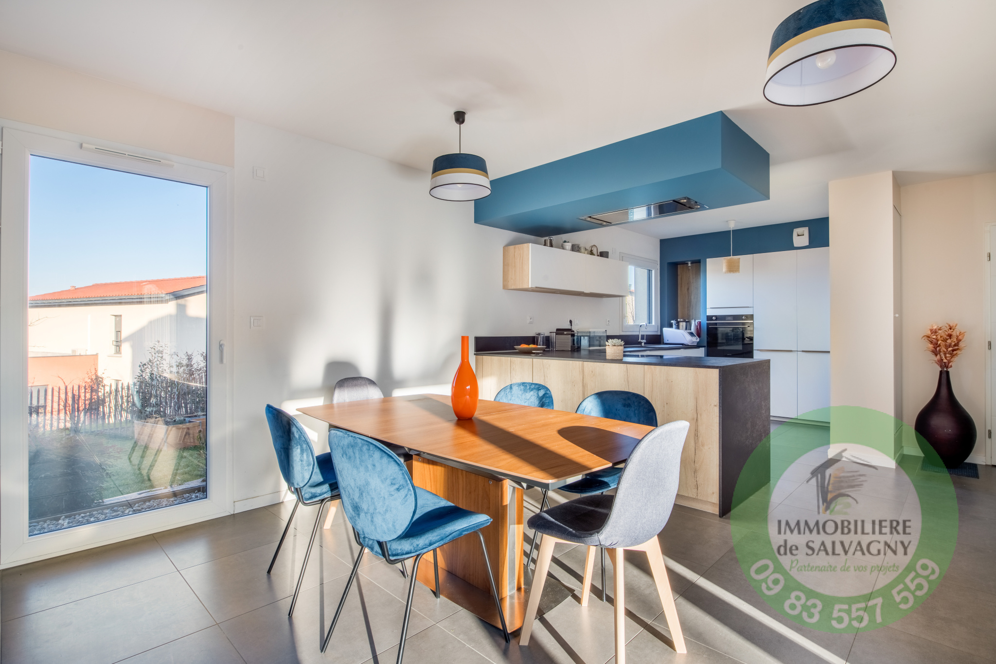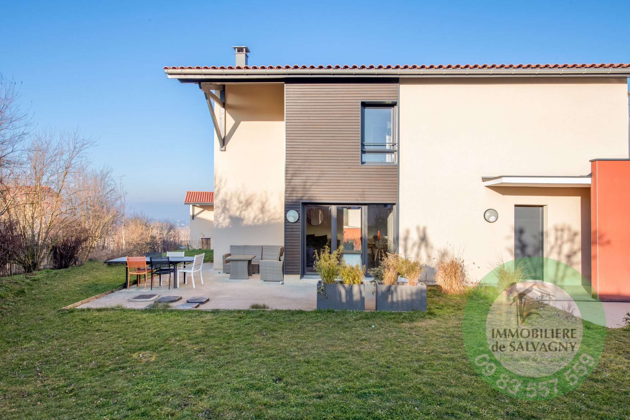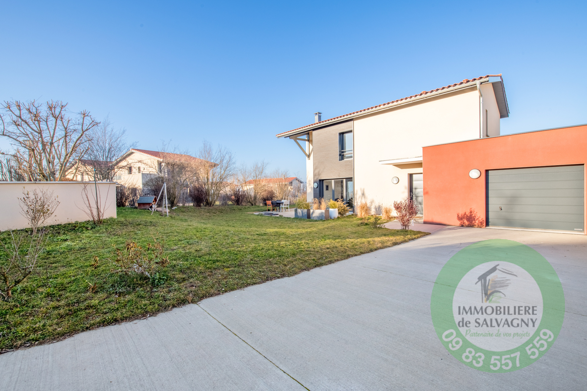 Belle maison contemporaine de 2018 (mitoyenne par le garage) d'une surface habitable de 119 m2. Emplacement privilégié avec écoles, commerces et transports à proximité. Elle se compose au rez-de-chaussée d'une lumineuse pièce à vivre (50 m2) avec salon/salle à manger et cuisine équipée. A l'étage : une chambre parentale avec salle d'eau, 2 chambres, 1 bureau, 1 salle de bains avec WC. En complément : une buanderie, un cellier et un garage. Chauffage par pompe à chaleur. Terrain clos piscinable de 675 m2. DPE : B - Renseignements et visites : IMMOBILIÈRE de SALVAGNY au 09 83 557 559.