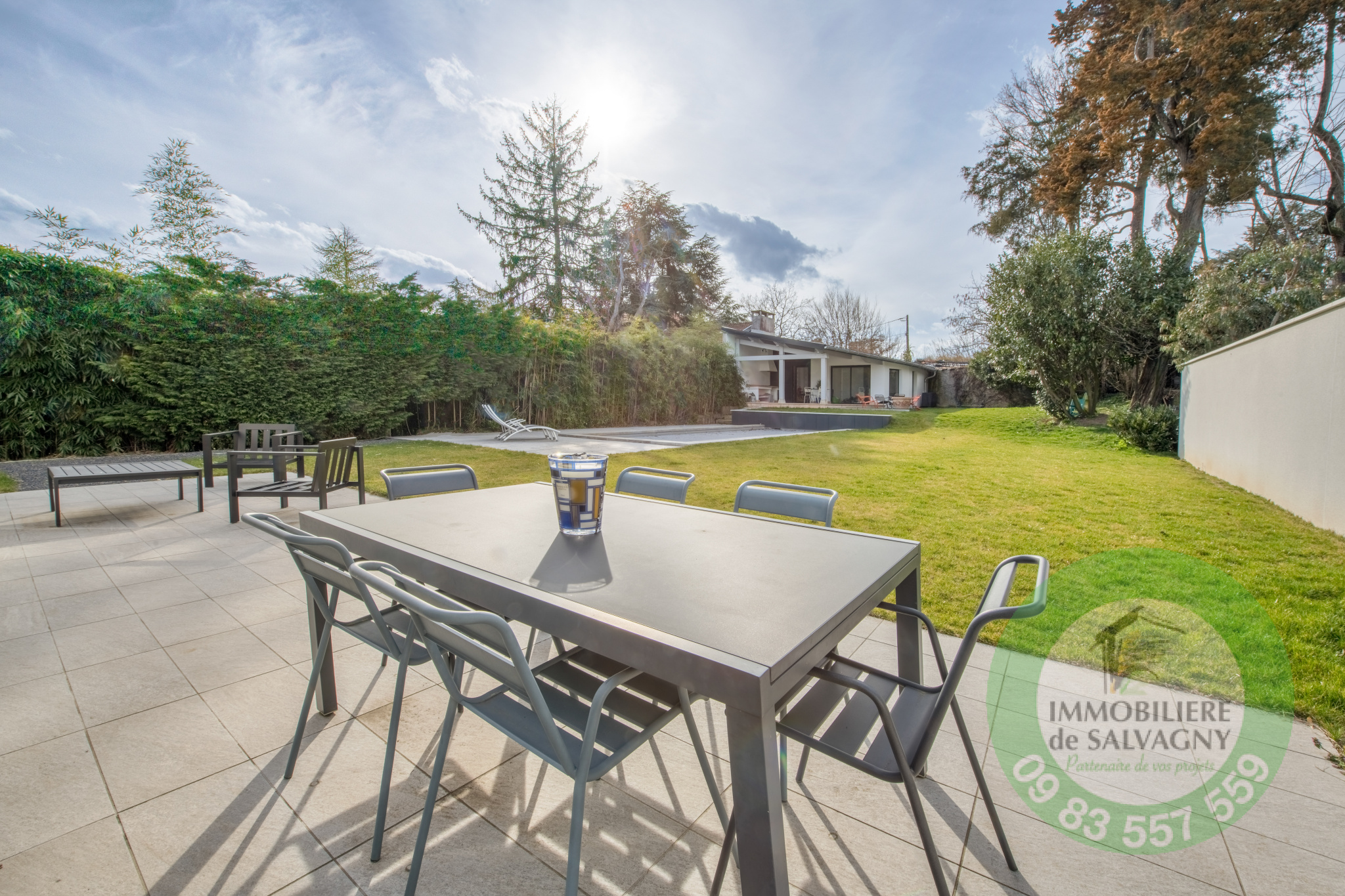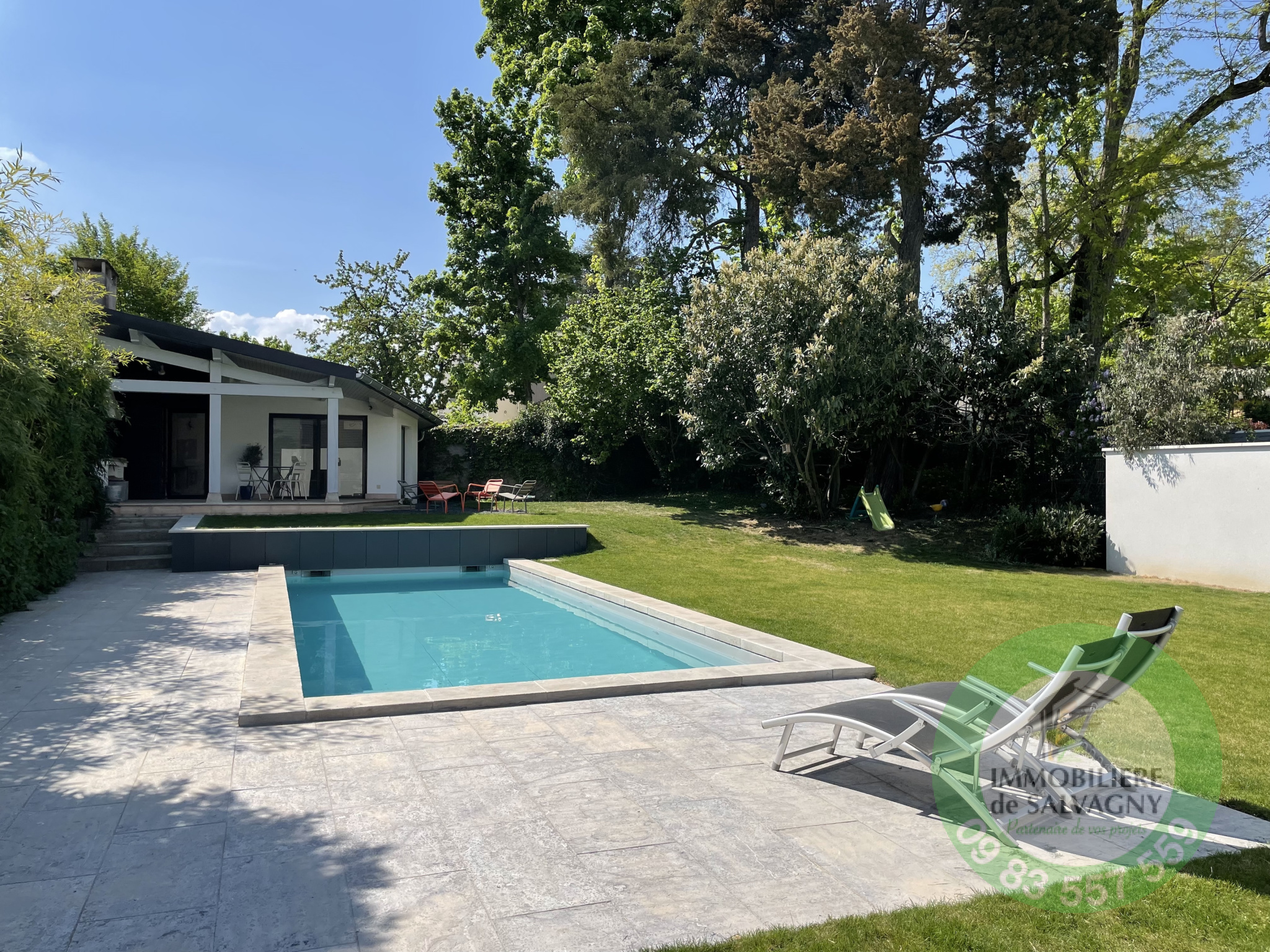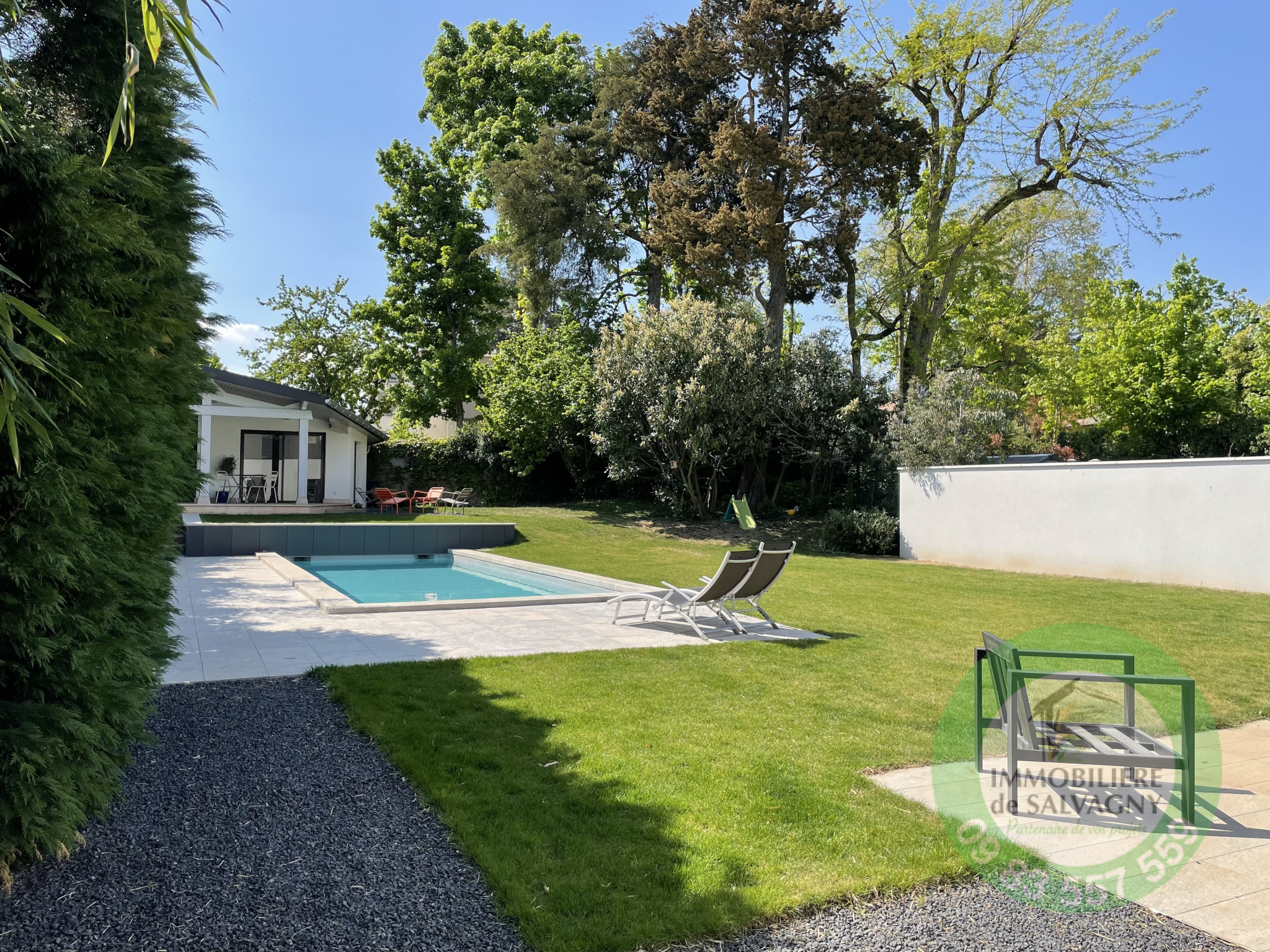 Idéalement bien placée à La Tour de Salvagny, superbe maison d'environ 180 m2 aux prestations récentes et contemporaines. L'entrée dessert une vaste pièce de vie lumineuse ouverte sur une terrasse de 50 m2, cuisine US équipée, deux belles chambres de plain-pied avec salle d'eau et salle de bains attenante, WC séparé. L'étage est parfait pour des enfants avec deux grandes chambres, une salle de jeux et WC séparé. Edifiée sur un terrain plat, clos et paysagé de 1210 m2, la maison dispose d'une piscine récente chauffée ainsi que d'un pool-house de 45 m2 abritant une véritable maison d'amis (chambre, salle d'eau, cuisine et WC). En complément au sous-sol de la maison : atelier, buanderie, chaufferie, deux caves. DPE : D. Renseignements et visites IMMOBILIÈRE de SALVAGNY 09 83 557 559