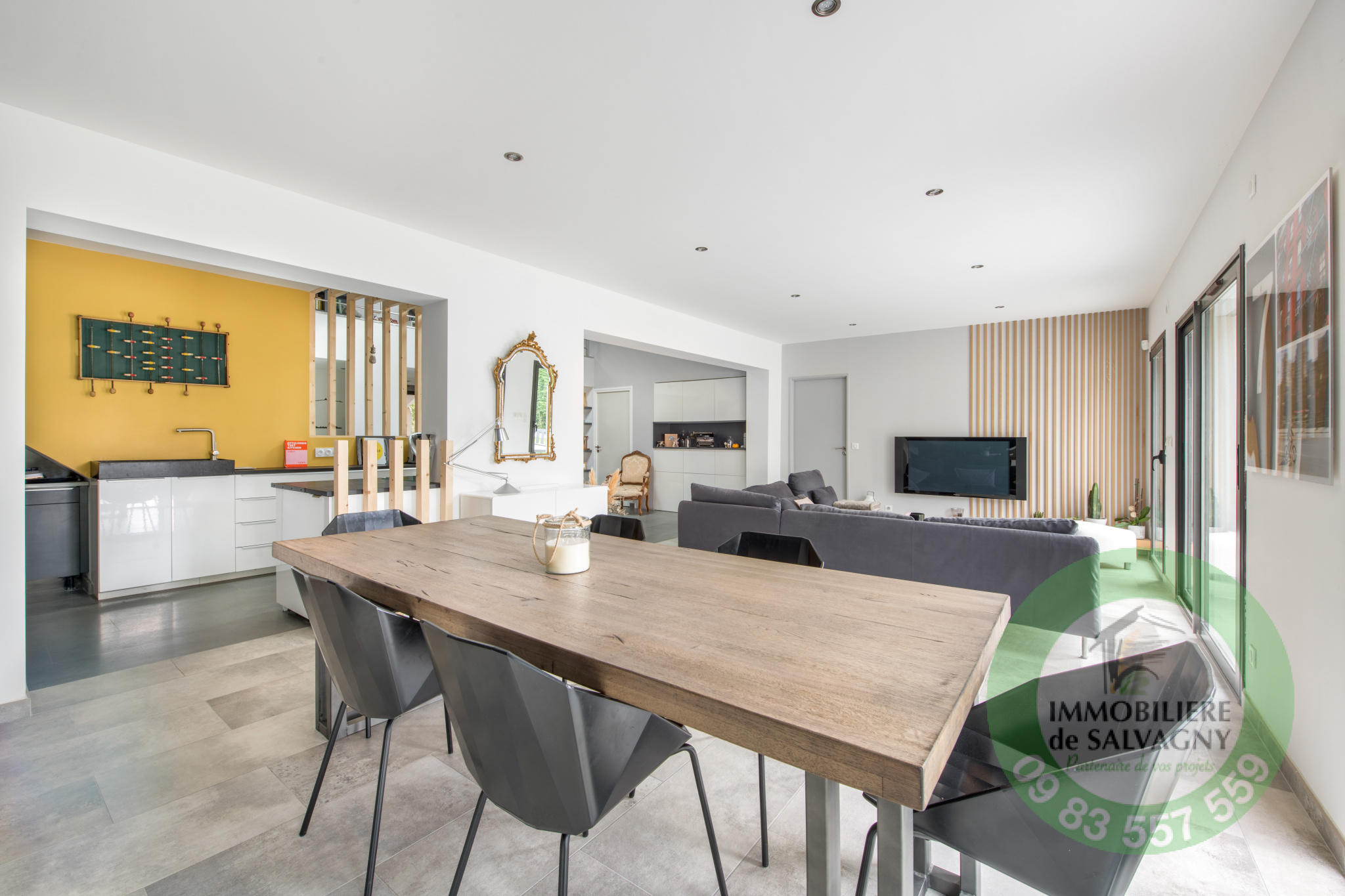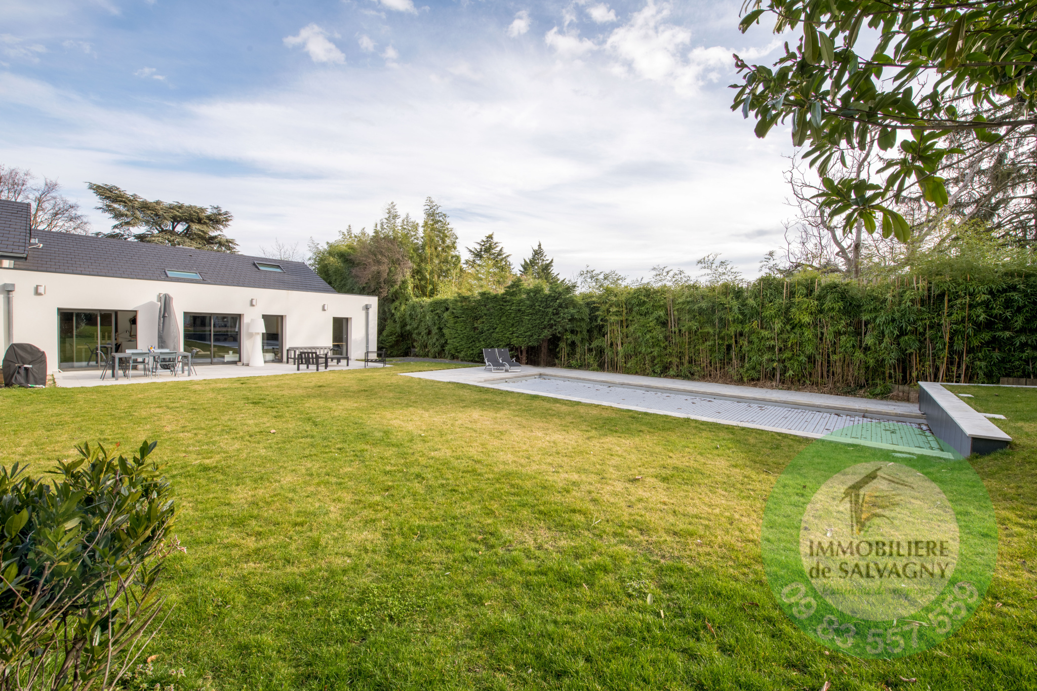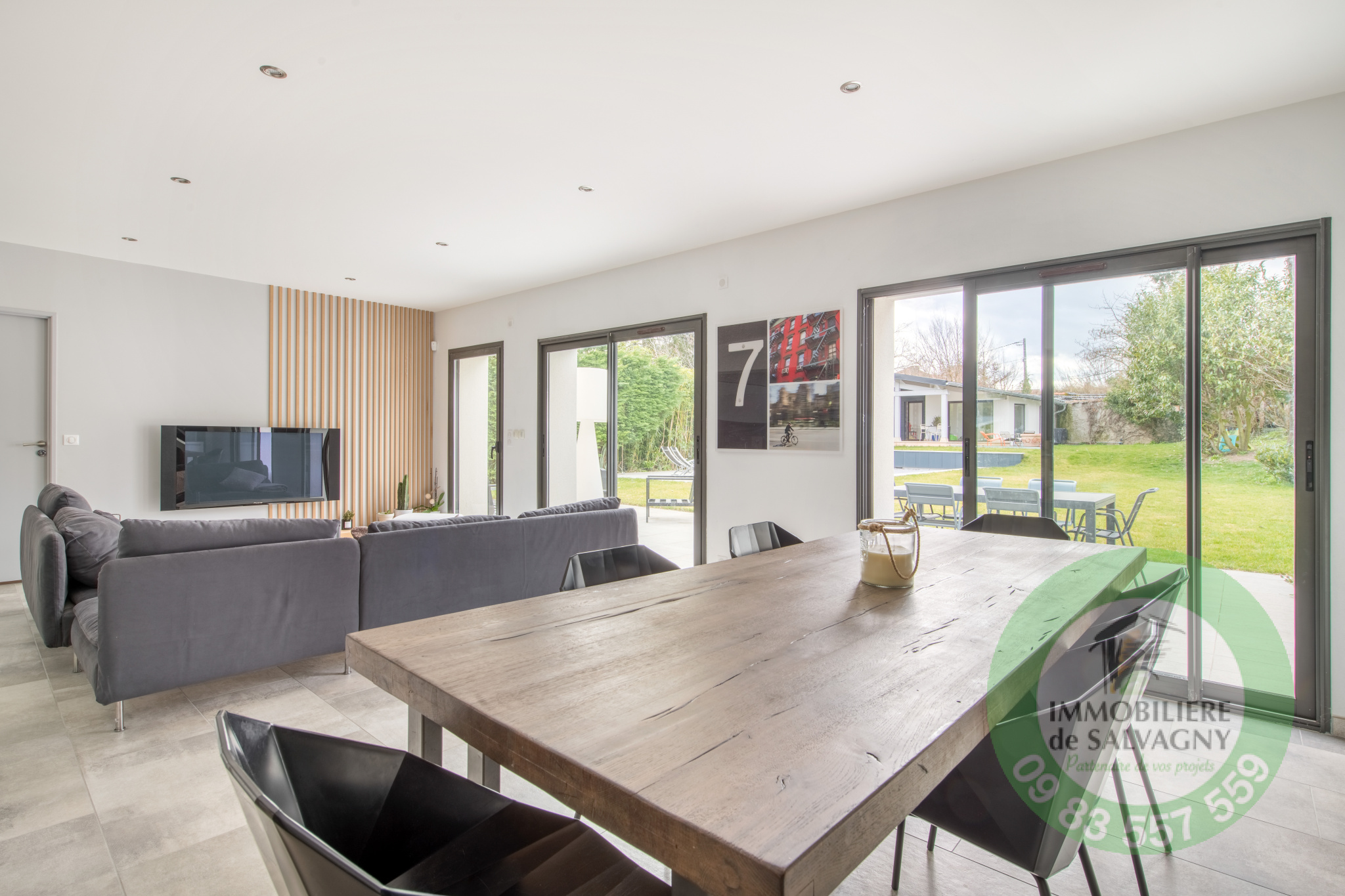 Idéalement bien placée à La Tour de Salvagny, superbe maison d'environ 180 m2 aux prestations récentes et contemporaines. L'entrée dessert une vaste pièce de vie lumineuse ouverte sur une terrasse de 50 m2, cuisine US équipée, deux belles chambres de plain-pied avec salle d'eau et salle de bains attenante, WC séparé. L'étage est parfait pour des enfants avec deux grandes chambres, une salle de jeux et WC séparé. Edifiée sur un terrain plat, clos et paysagé de 1210 m2, la maison dispose d'une piscine récente chauffée ainsi que d'un pool-house de 45 m2 abritant une véritable maison d'amis (chambre, salle d'eau, cuisine et WC). En complément au sous-sol de la maison : atelier, buanderie, chaufferie, deux caves. DPE : D. Renseignements et visites IMMOBILIÈRE de SALVAGNY 09 83 557 559