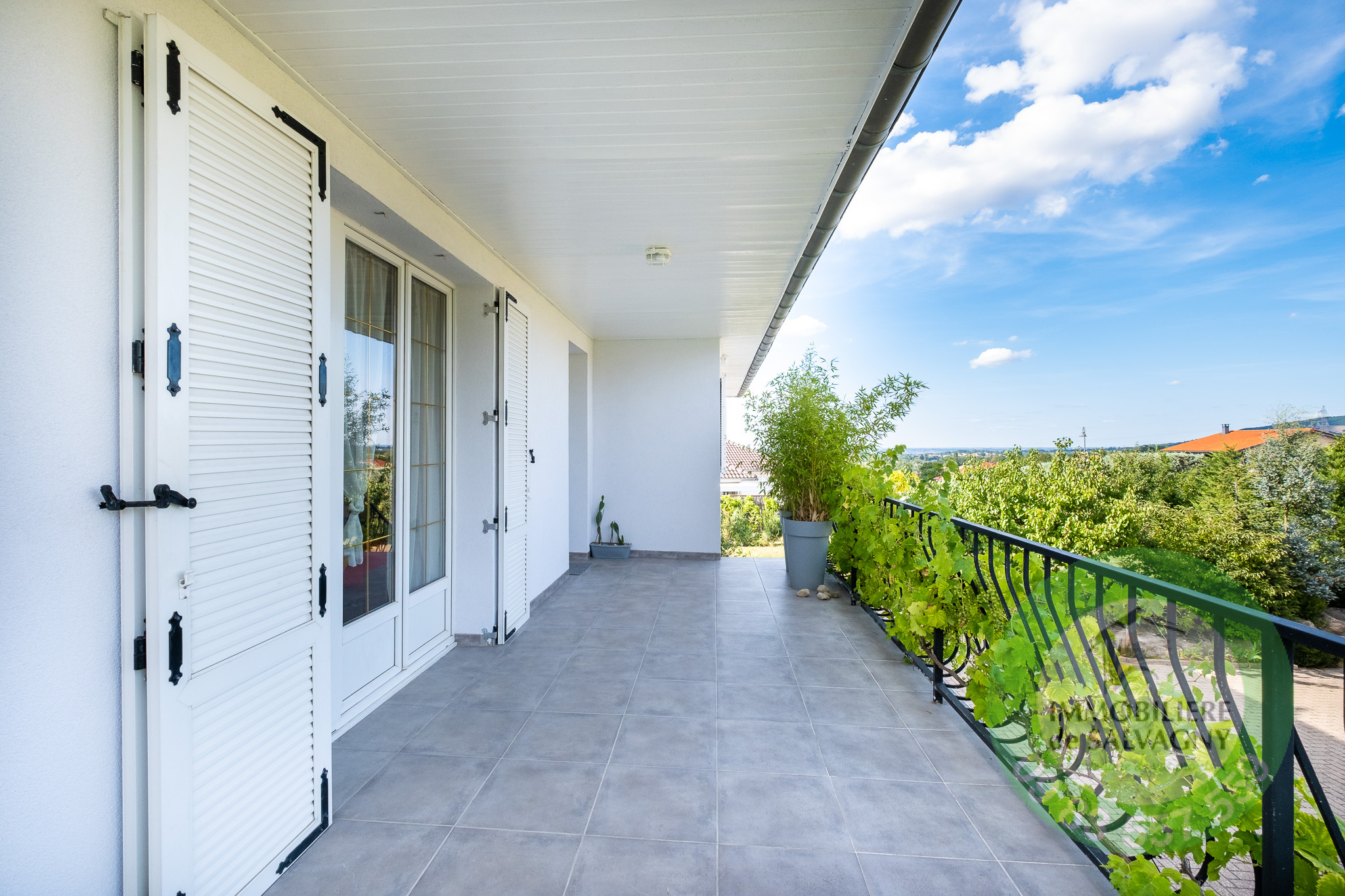 L'accès à la maison se fait par un bel escalier carrelé et une terrasse de 16 m2 avec vue sur la piscine. Une belle entrée de 8 m2 dessert un séjour / salle à manger traversant et lumineux (Est / Sud / Ouest). La cuisine équipée est attenante au séjour et pourra être facilement ouverte. La maison dispose en tout de 6 belles chambres dont 3 (14m2, 12m2 et 11m2) au niveau de l'espace de vie. La salle de bains est équipée d'une douche et d'une baignoire. Les WC sont séparés.